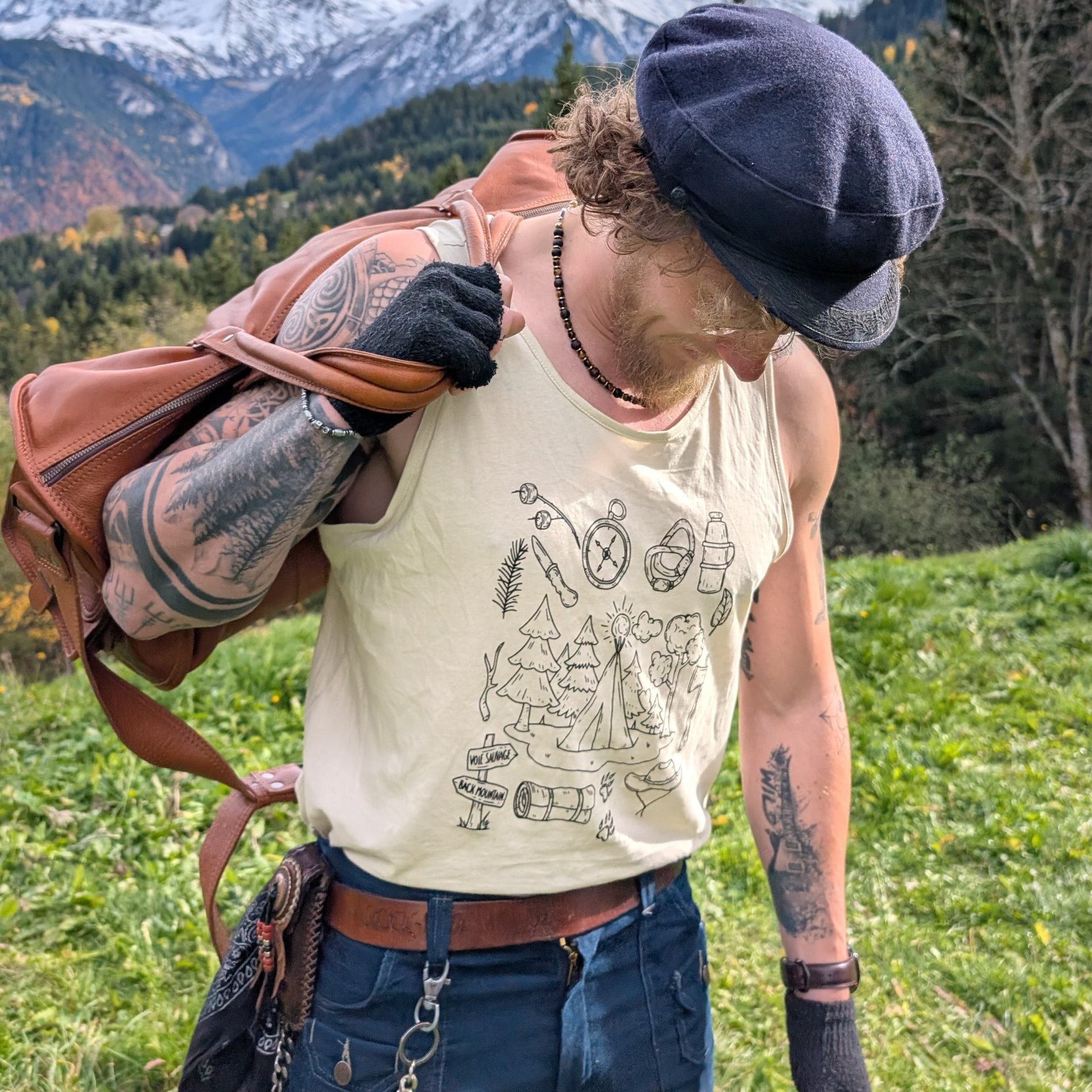 Confectionné à 100 % en coton doux et respirant (grammage 140 g/m²), ce débardeur allie confort et légèreté, idéal pour vos explorations estivales ou vos moments de détente. Ses motifs dessinés, rappellent les éléments essentiels de la vie en plein air — boussole, feu de camp, sentier, et nature sauvage.